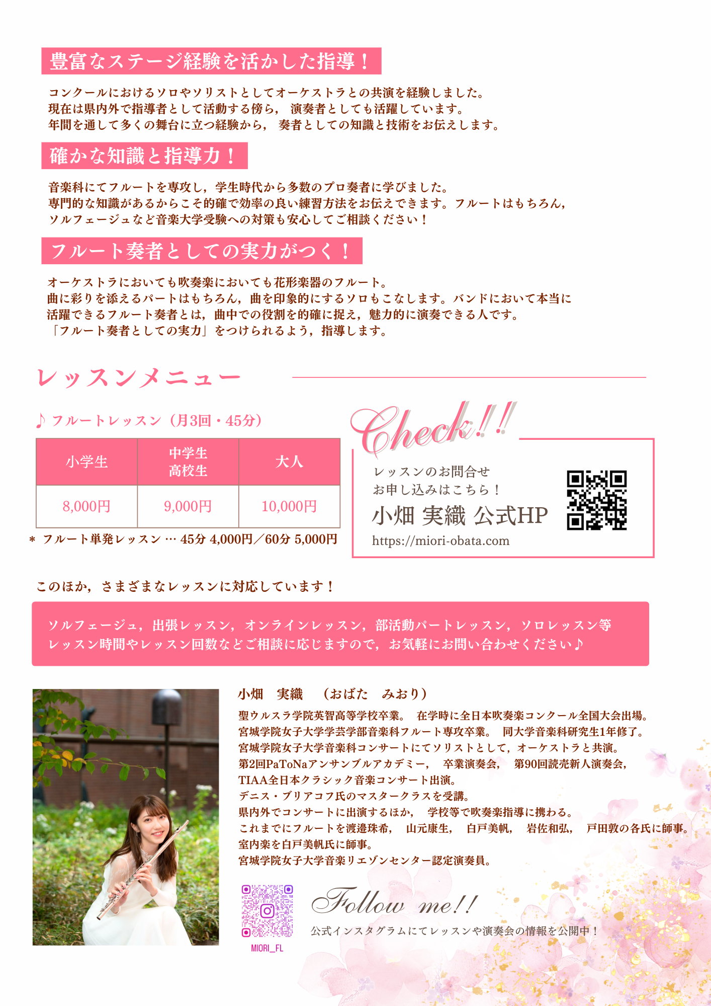 HOME | ポスター・フライヤー Poster/Flyer 鮮やかに魅せる 数多くのフライヤーやポスターの中でも一際目を引くデザインをご提供致します。QRコードの掲載も無料で承っておりますので,お気軽にご相談ください。 フルート教室A4フライヤー(表) フルート教室A4フライヤー(裏) 吹奏楽部A2ポスター・A4フライヤー 吹奏楽部A2ポスター・A4フライヤー 吹奏楽部合同演奏会A2ポスター・A4フライヤー 吹奏楽部A2ポスター・A4フライヤー 宮城県サッカー協会A2ポスター・A4フライヤー 吹奏楽部A2ポスター・A4フライヤー 吹奏楽部A2ポスター・A4フライヤー 吹奏楽部宣伝用画像 吹奏楽部A2ポスター・A4フライヤー
